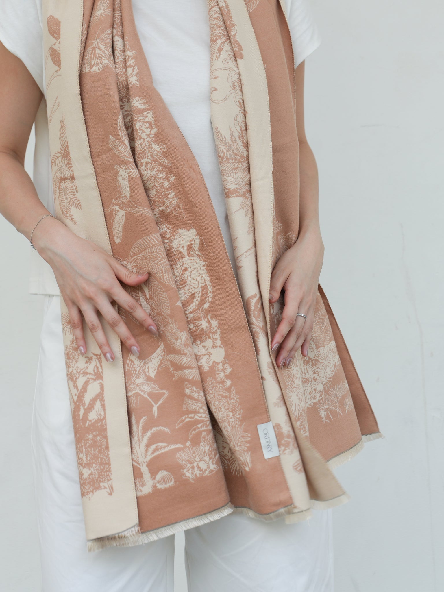 From the dense tropical rainforests of the Malayan Peninsula, to the lush foliage of the Amazon. A bird calls in the distant, while the sweet smell of heliconias drift through the warm air. Dragonflies and palm trees meander over the 1819 shawl, while mystery and adventure await whichever traveller adorns it.