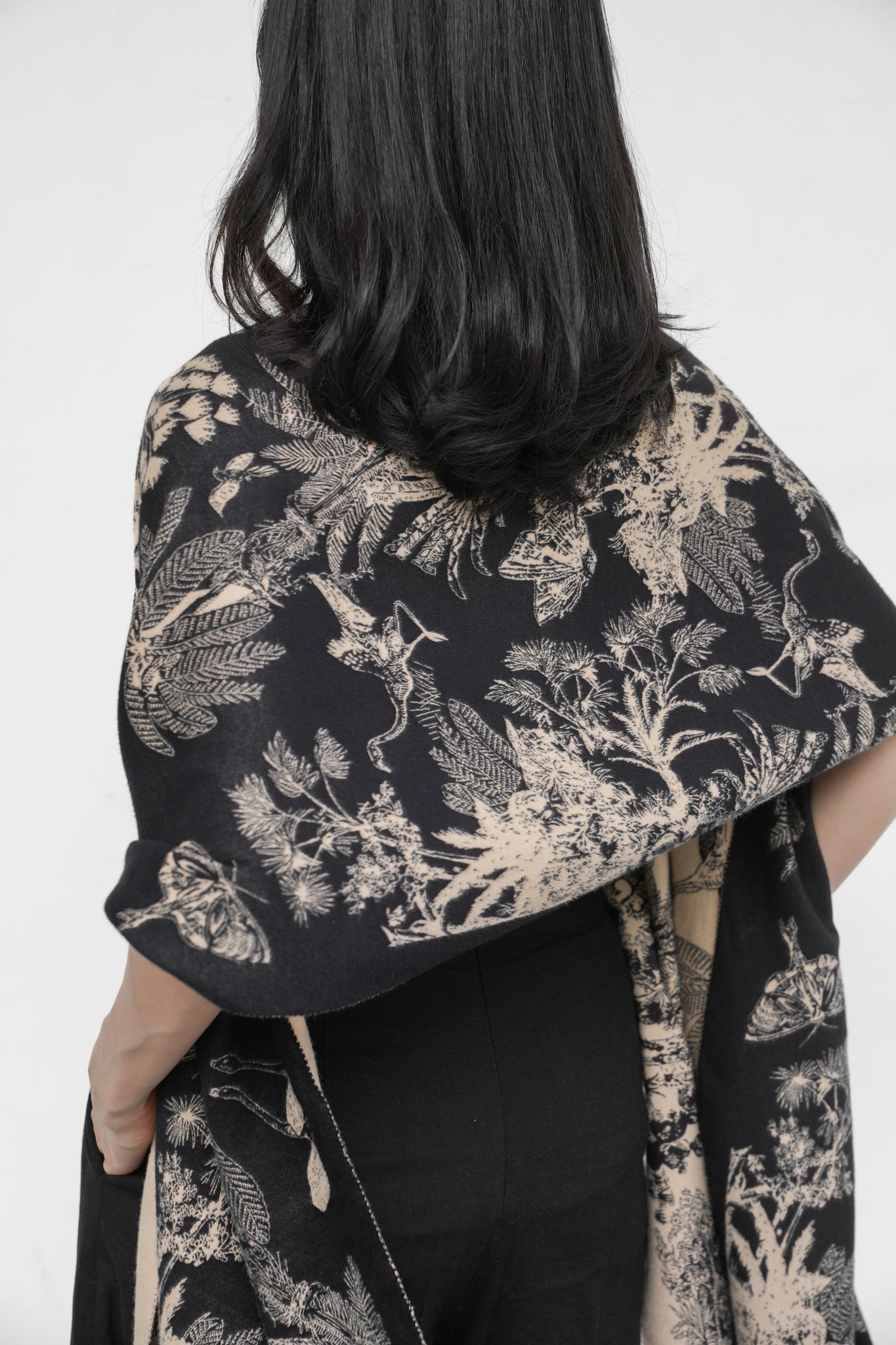 From the dense tropical rainforests of the Malayan Peninsula, to the lush foliage of the Amazon. A bird calls in the distant, while the sweet smell of heliconias drift through the warm air. Dragonflies and palm trees meander over the 1819 shawl, while mystery and adventure await whichever traveller adorns it.